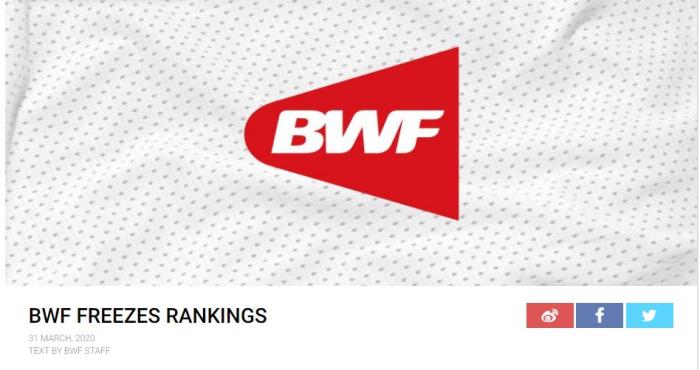 北京时间3月31日晚,世界羽联宣布将冻结从3月17日起的世界排名和世界青少年排名,恢复日期另行通知。