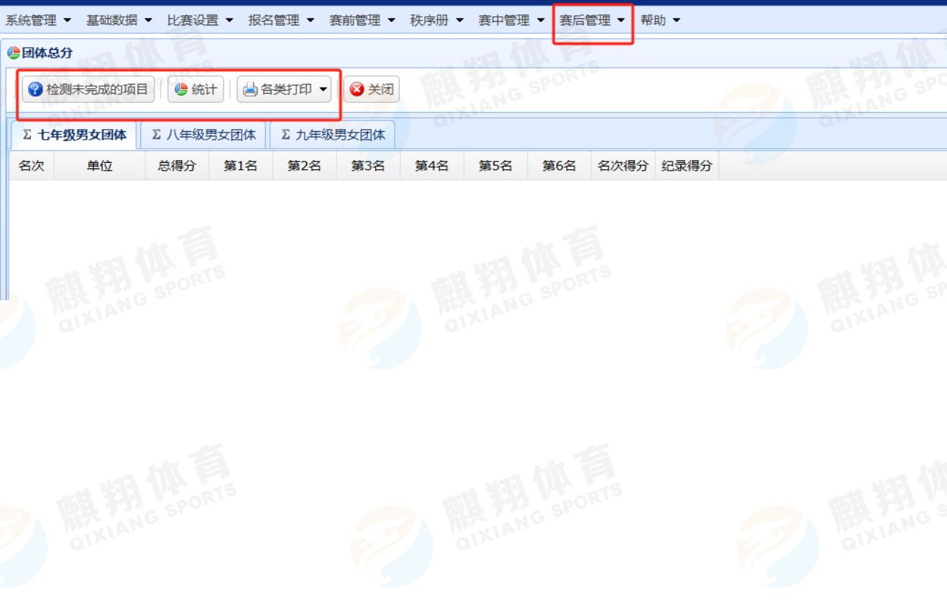 点击【赛后管理】-【团体总分】-【检测未完成项目】-【统计】-【各类打印】-【汇总表】。