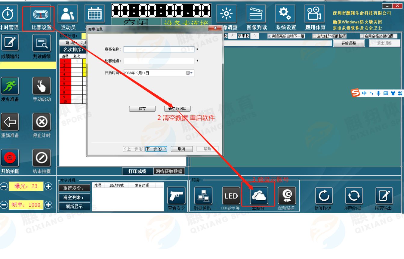 连接电计设备-打开【电计软件】-【比赛设置】-【清空数据库】-【登录云账号】。